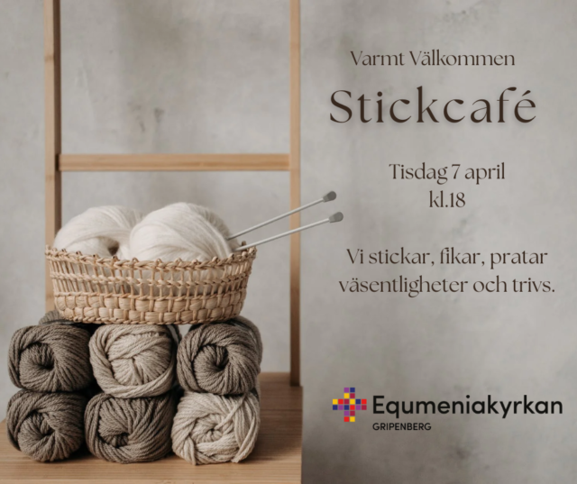 Detta evenemang har redan ägt rum. 7 apr 18:00 - 19:30 Stickcafé Vi stickar, fikar, pratar väsentligheter och trivs. Lägg till i kalender Google Kalender iCalendar Outlook 365 Outlook Live Dela